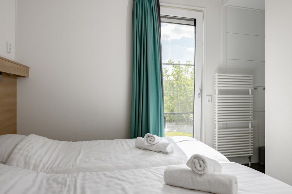 Deze vrijstaande en gelijkvloerse lodge is geschikt voor 4 personen. In de woonkamer vind je een zithoek met smart-tv. De keuken is onder andere uitgerust met een vaatwasser, combimagnetron en koel-/vriescombinatie. De lodge heeft 2 slaapkamers met beide 2 eenpersoons boxspringbedden. Daarnaast zijn er 2 badkamers met douches en in de hal bevindt zich een apart toilet. Ook is er een tuin met meubilair. je kunt gratis gebruikmaken van wifi en er is parkeergelegenheid voor één auto bij de lodge. Enkele lodges zijn luxe uitgevoerd met een wasmachine, wasdroger, televisie op de slaapkamer, loungeset en zonneligbedden. Deze lodges zijn met voorkeur te boeken.