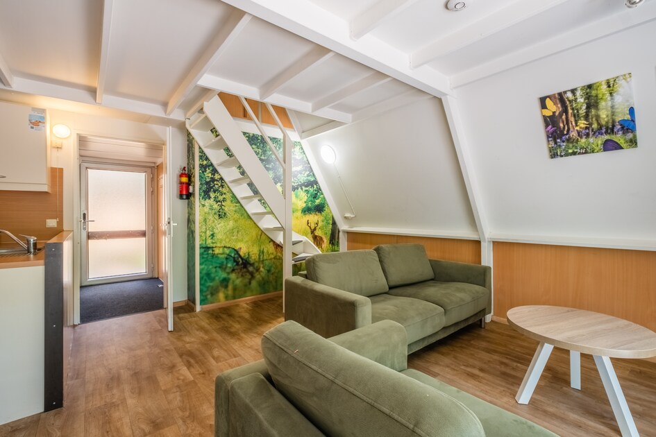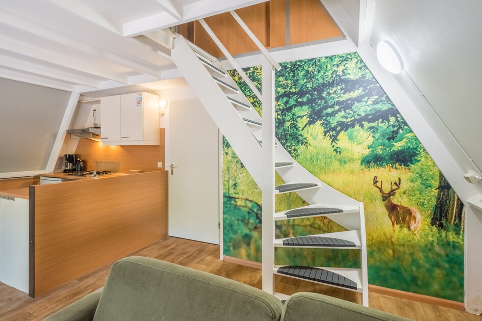 Goed om te weten: De bungalow is voorzien van een steile, smalle trap die naar de bovenverdieping leidt. Er is een trapleuning aan één zijde van de trap. Het plaatsen van een traphekje is alleen boven mogelijk.